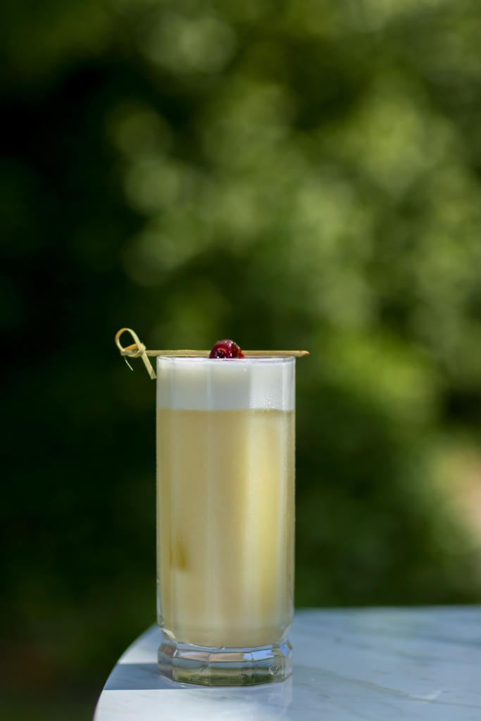 *Build in shaker, dry shake vigorously with all ingredients, add ice and shake again, add soda water to tin, double strain over ice into Collins glass.