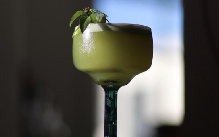 Of the recipe, Karl says: “[I] had no lime or lemon but did have apple cider vinegar. Decided to go completely off the cuff and make a spin on a skinny girl marg as had pressed celery juice (don’t judge). Infused green chartreuse with the Thai basil, growing in my kitchen, to give the celery a broader vegetal note. Added Serrano to tie it together and then egg white to give it the texture it needed ~ also seemed fitting with the theme.”