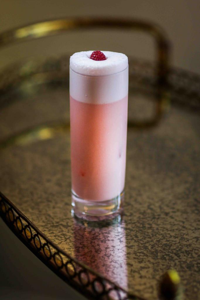 Add ½ oz soda water to bottom of collins glass and set aside. Dry shake all ingredients, add ice, wet shake for 1-2 minutes. Double strain into collins glass, tap bottom of the glass with muddler or spoon before adding the rest of the soda water.